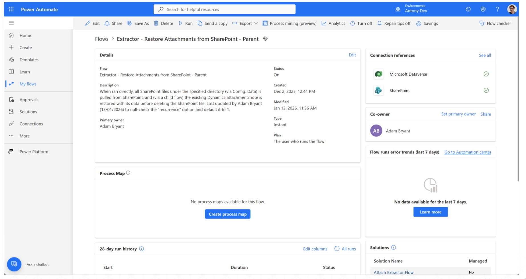 In the event you want to uninstall the solution, or if you simply want to re-add the attachments, an admin can access and run the flow Extractor - Restore Attachments from SharePoint - Parent via Power Automate (or Power Apps). This will run in the background and restore all applicable attachments.