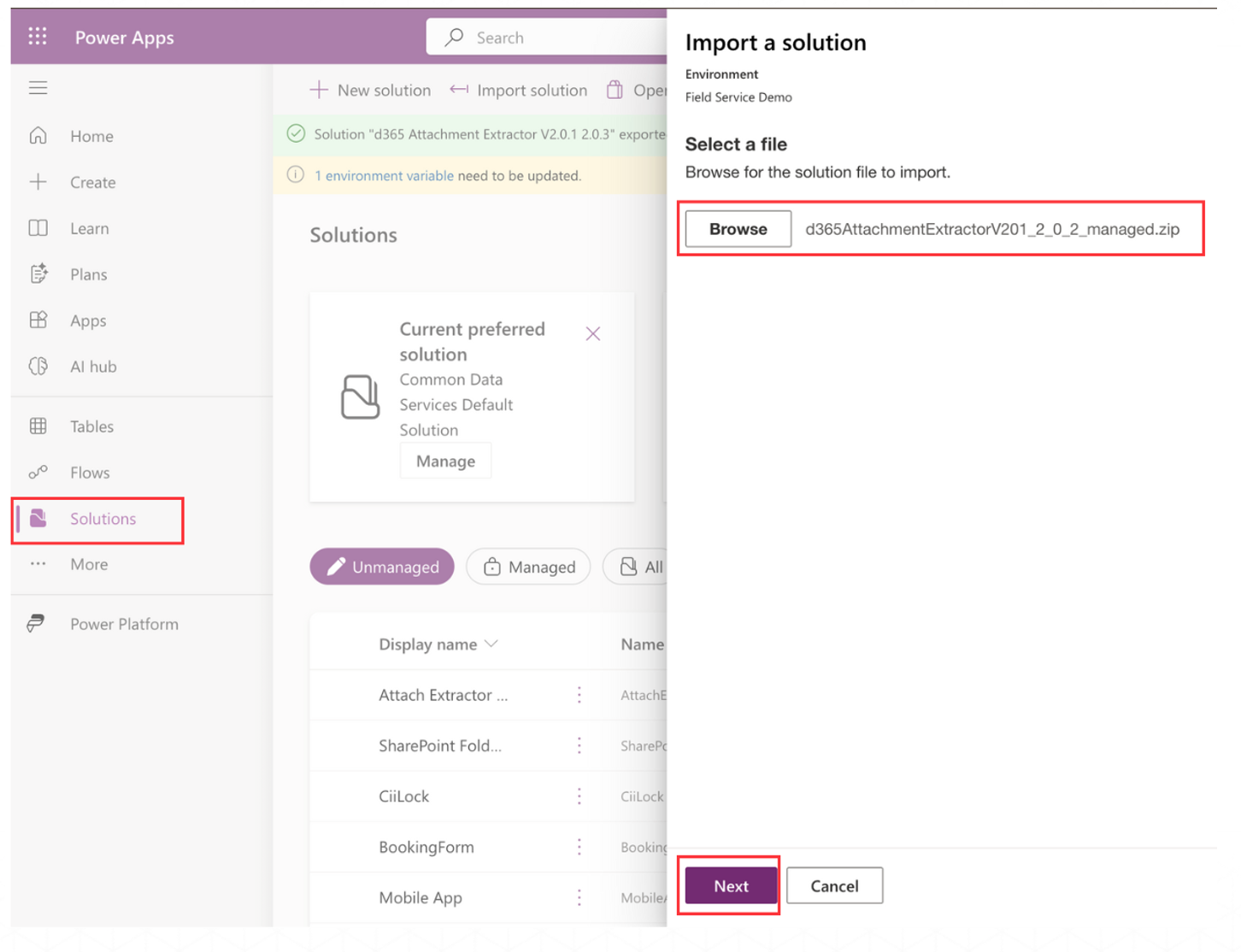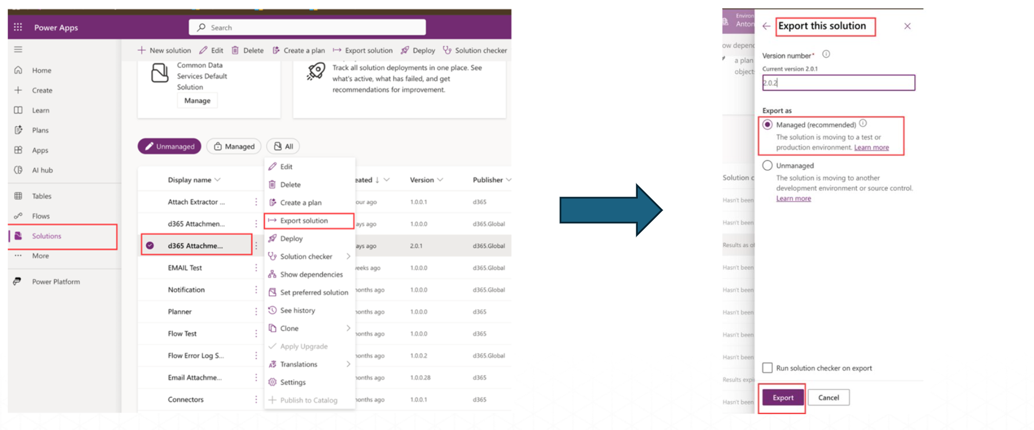 To import the solution in a new environment, first we will have to export extractor’s main solution Email Attachments to SharePoint.