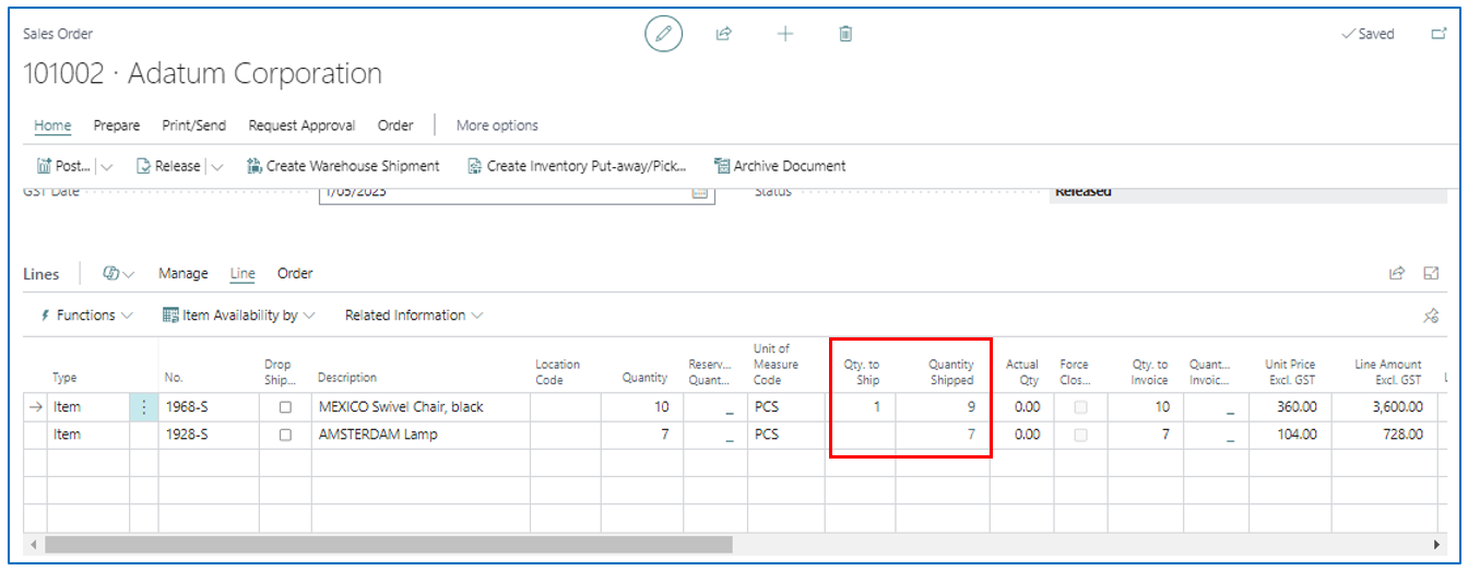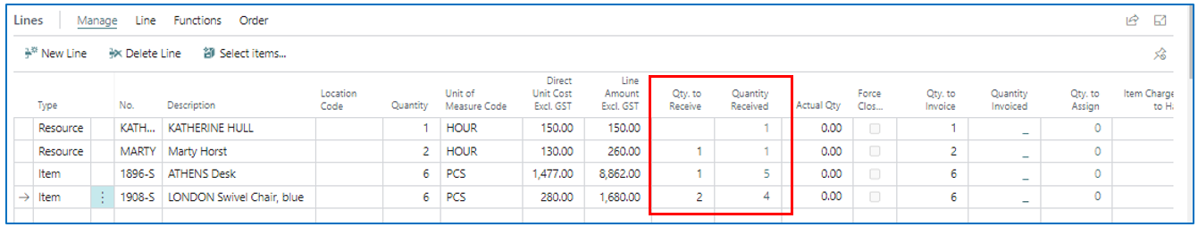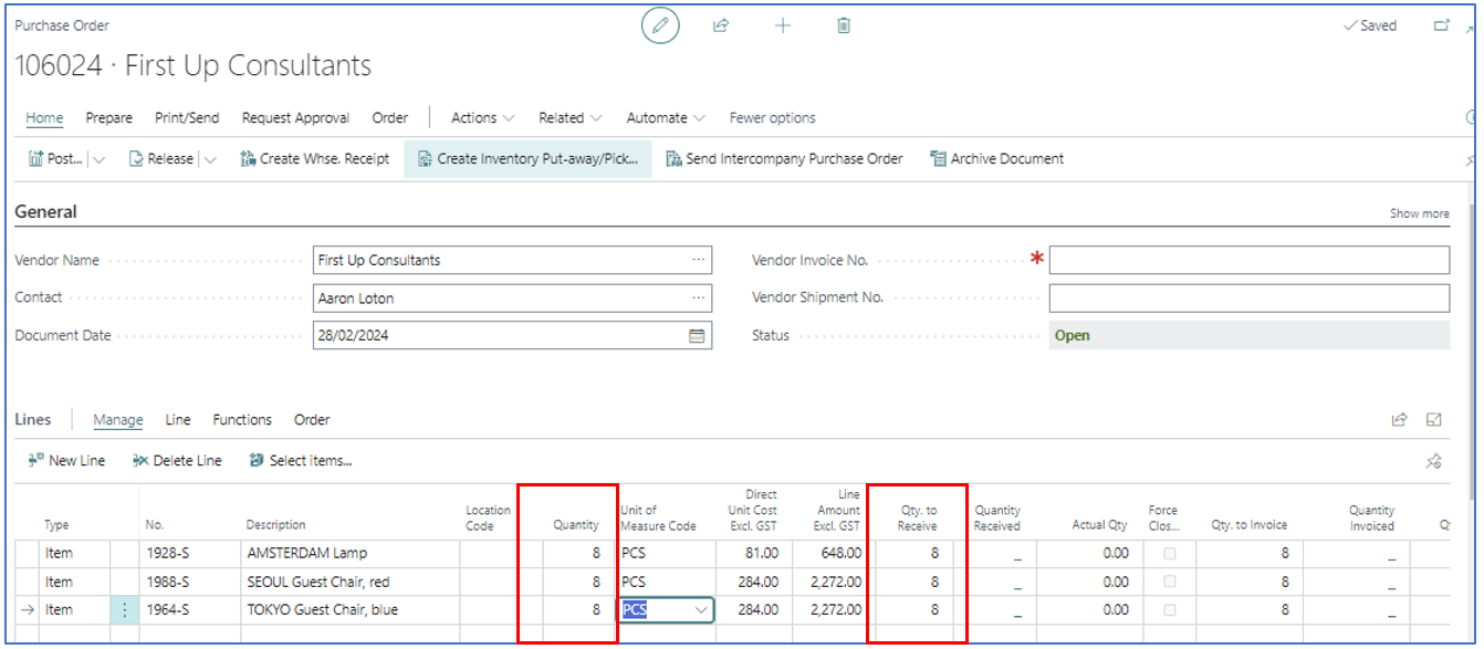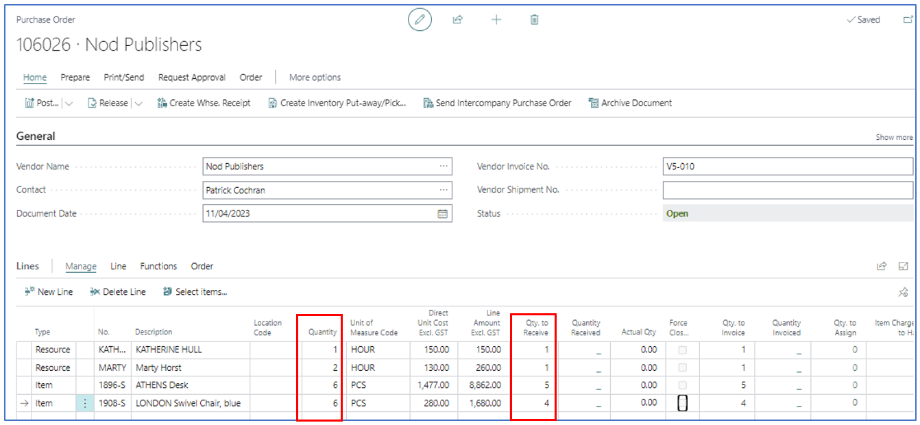 After updating the Qty to Receive accordingly, Receive post the PO to confirm quantities received. The outcome will be a Released purchase order with the balance to receive for each PO line.