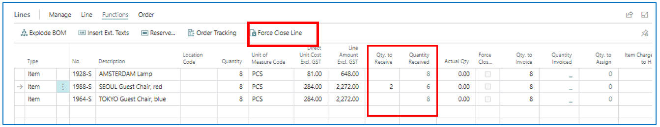 If you have a PO with several lines, and some of the lines have quantity balances yet to be received and you would like to close off and archive the PO, you can use the Force Close function from the PO line.