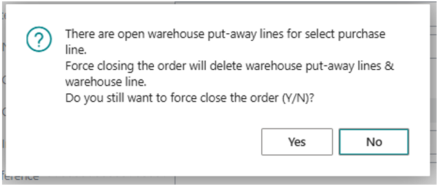 The system prompts that there are pending unreceived quantities, if without warehouse enabled.