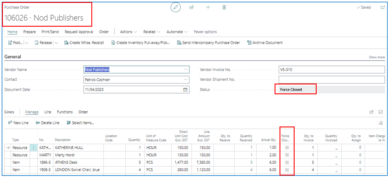 From here, the Purchase Order can be “Invoice” posted. The Qty to Invoice would have been updated by the “Force Closed” process.