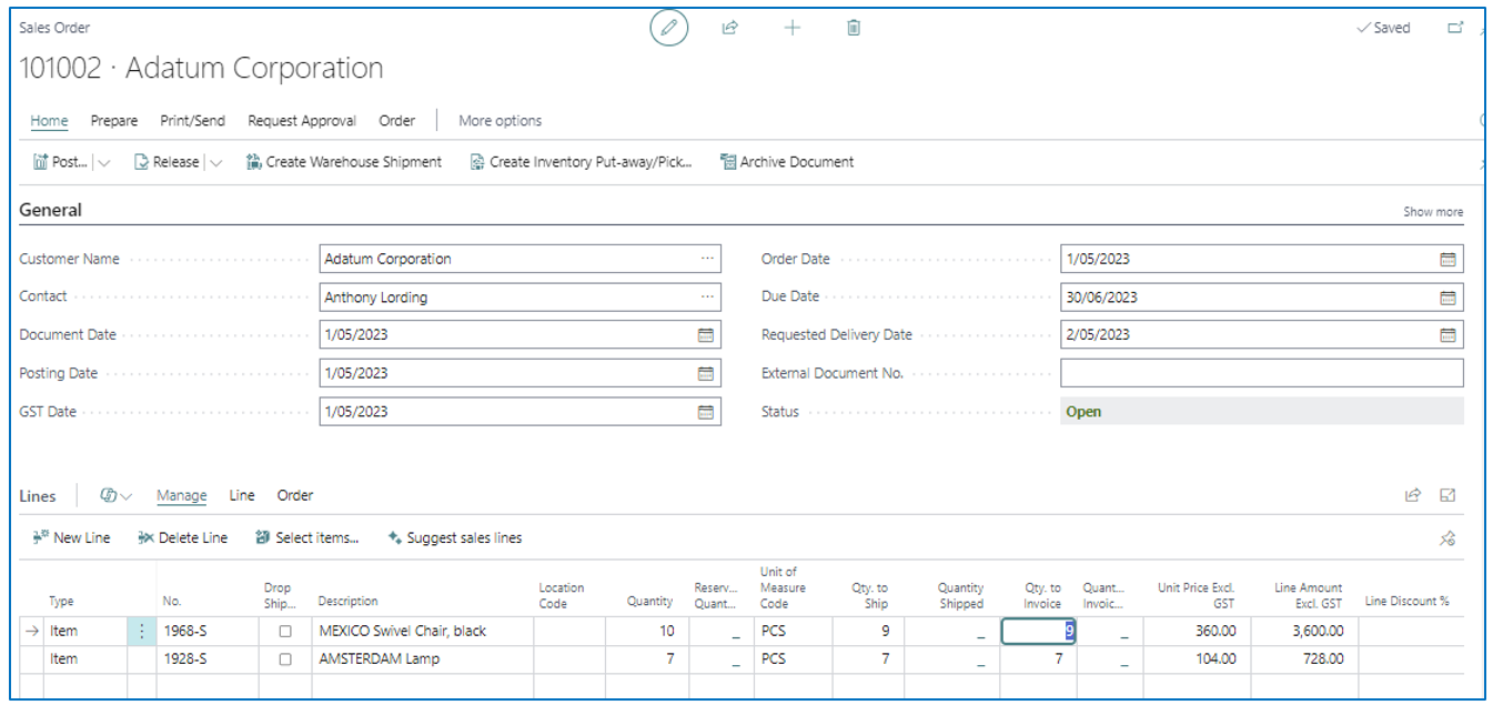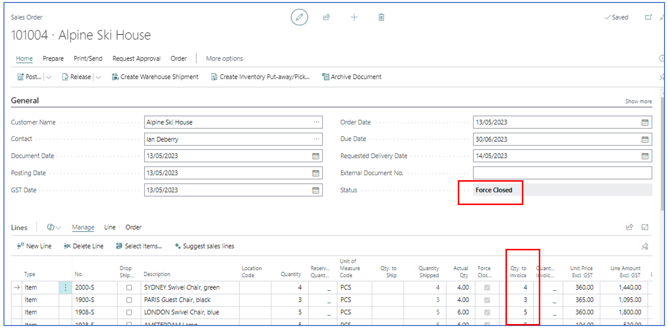 After the sales order has been Force Closed, the shipped quantities are confirmed, and the order can be invoice posted to send the correct sales invoice to the customer. The Sales Order is also archived.