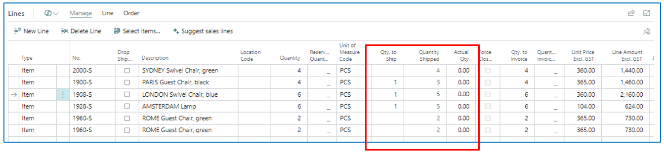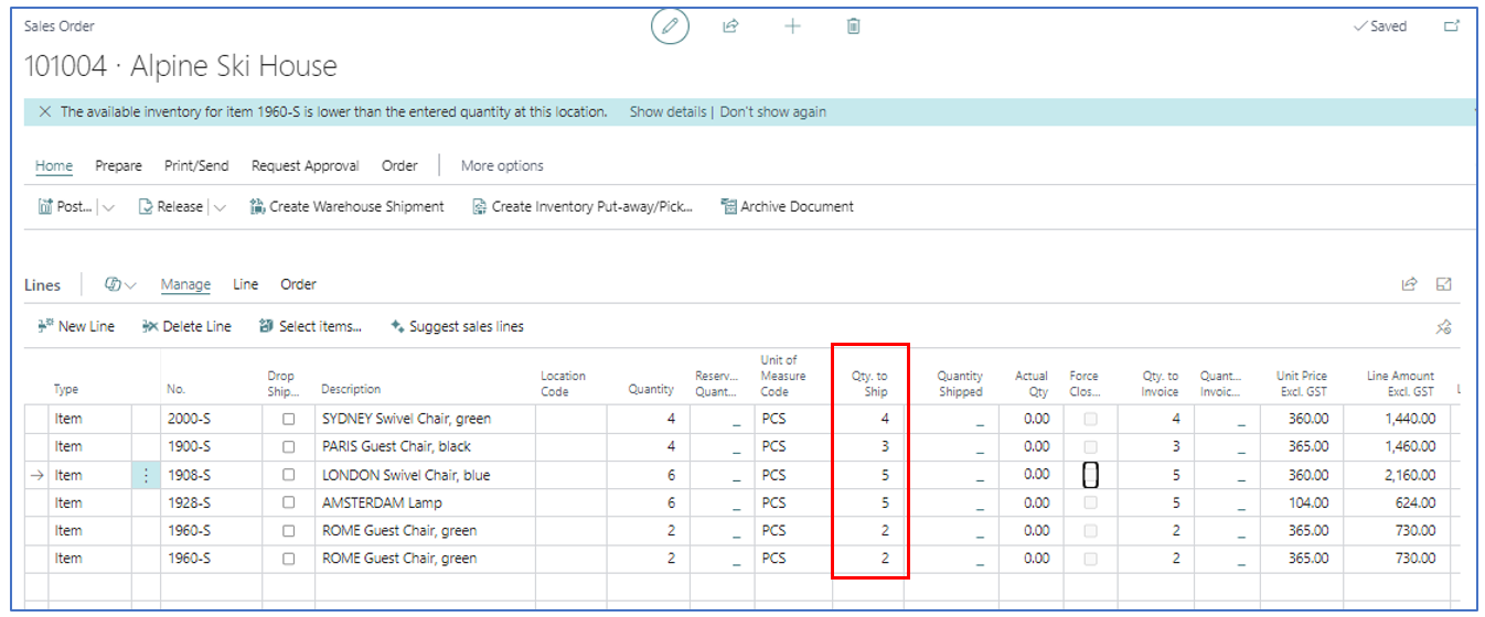 Navigate to the line with insufficient stock. After confirming the stock quantity to be shipped in Qty. to Ship, post “Ship” the order.