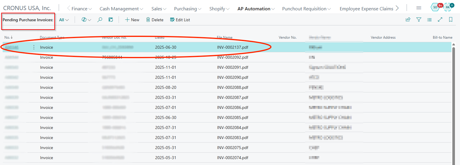 Pending Purchase Invoices List: Shows all invoices awaiting mapping, approval, or posting. Filter by vendor, date, or status. Use batch actions for bulk processing.
