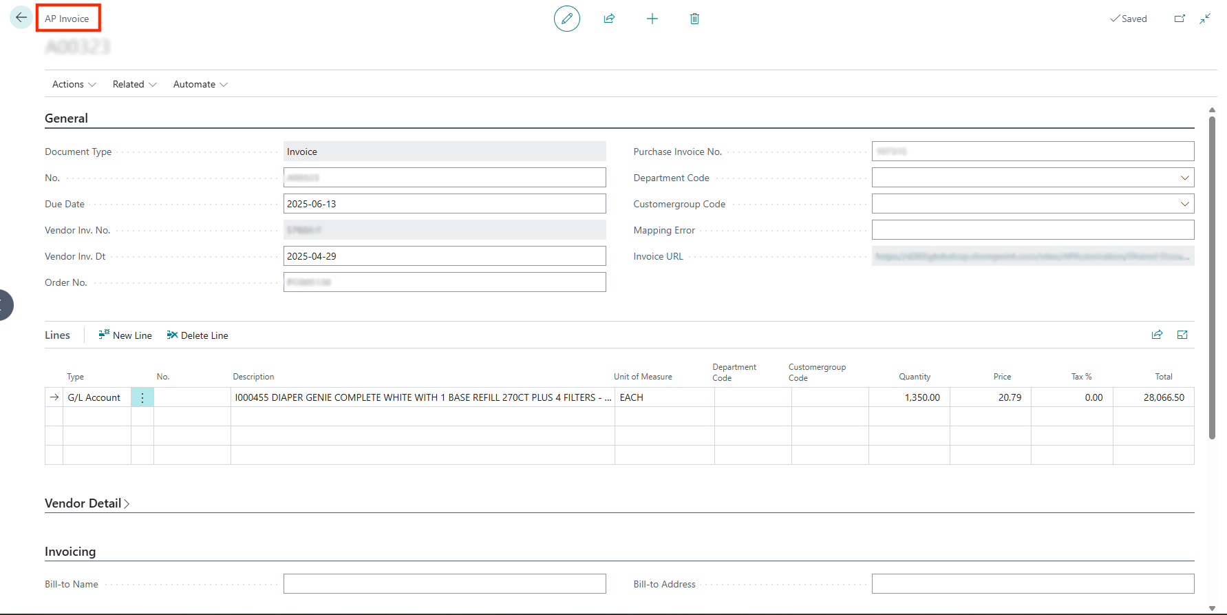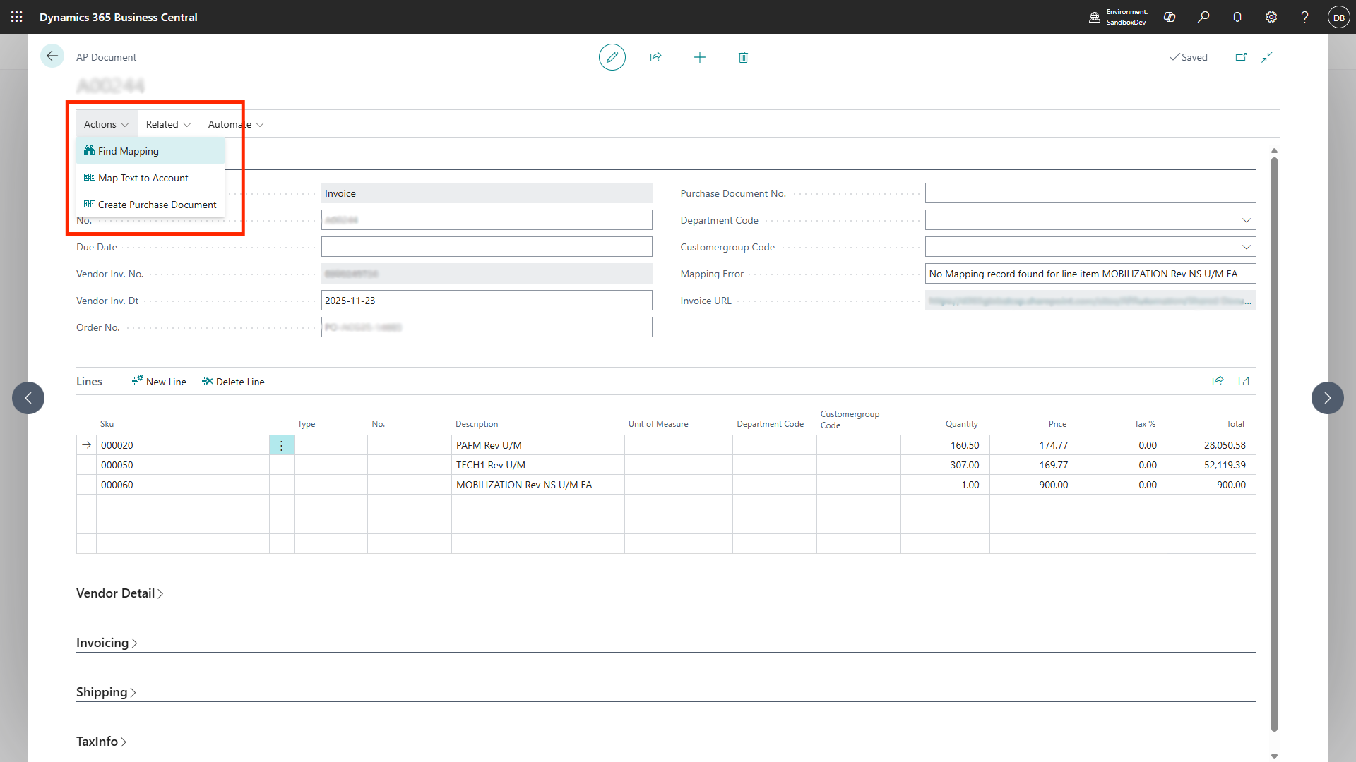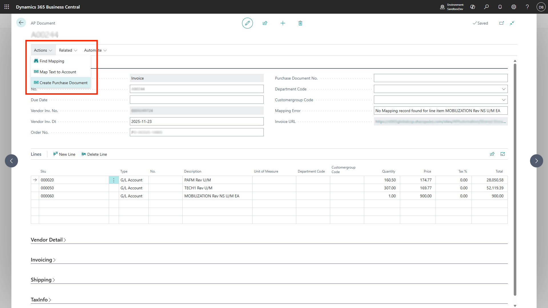 - Find Mapping Feature: This is the AI-driven step where the system intelligently analyzes the extracted invoice data and suggests mappings to corresponding records in Business Central. It proposes links between invoice fields and vendor records, G/L accounts, or cost centers. The user’s role is to simply confirm or, if necessary, edit these suggestions.