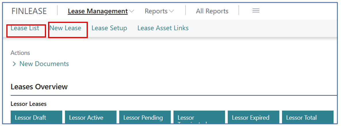 - Select menu option [Lease Management] > [Lease Setup] (or search for Lease Setup)