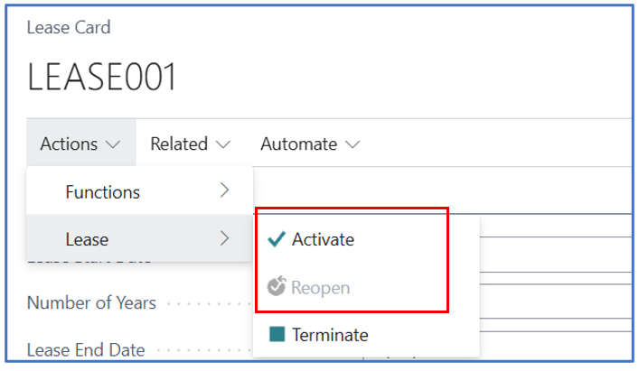 Select [Actions] > [Lease] > [Activate] to update the lease status to Active.