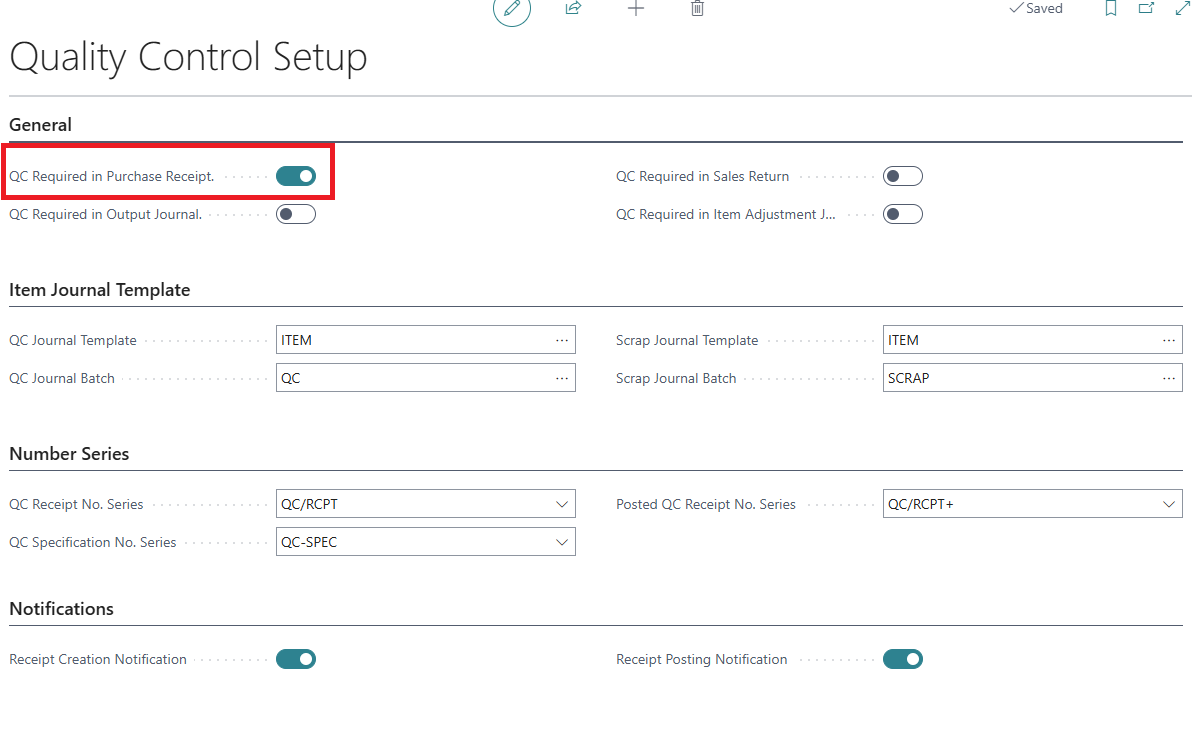 QC Journal Template and Journal Batch: This is used to record items that passed QC inspections according to the Quality Specifications.