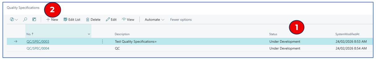 Navigate to the Quality Specifications list page to view the quality specifications defined, examples: