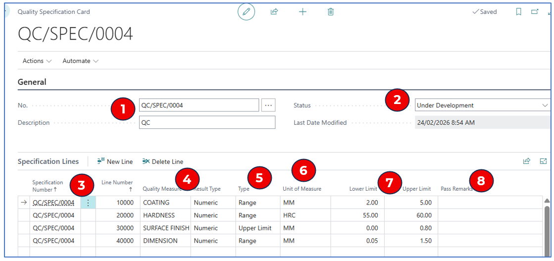 Status: This determines if the Quality Specification is ready for use (“Certified”) or is “New”, “Under Development” or “Closed”.