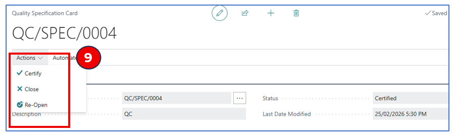 - Once the Quality Specification Card is completed, release it with a Certified status. This is done with menu option Actions > Certify.