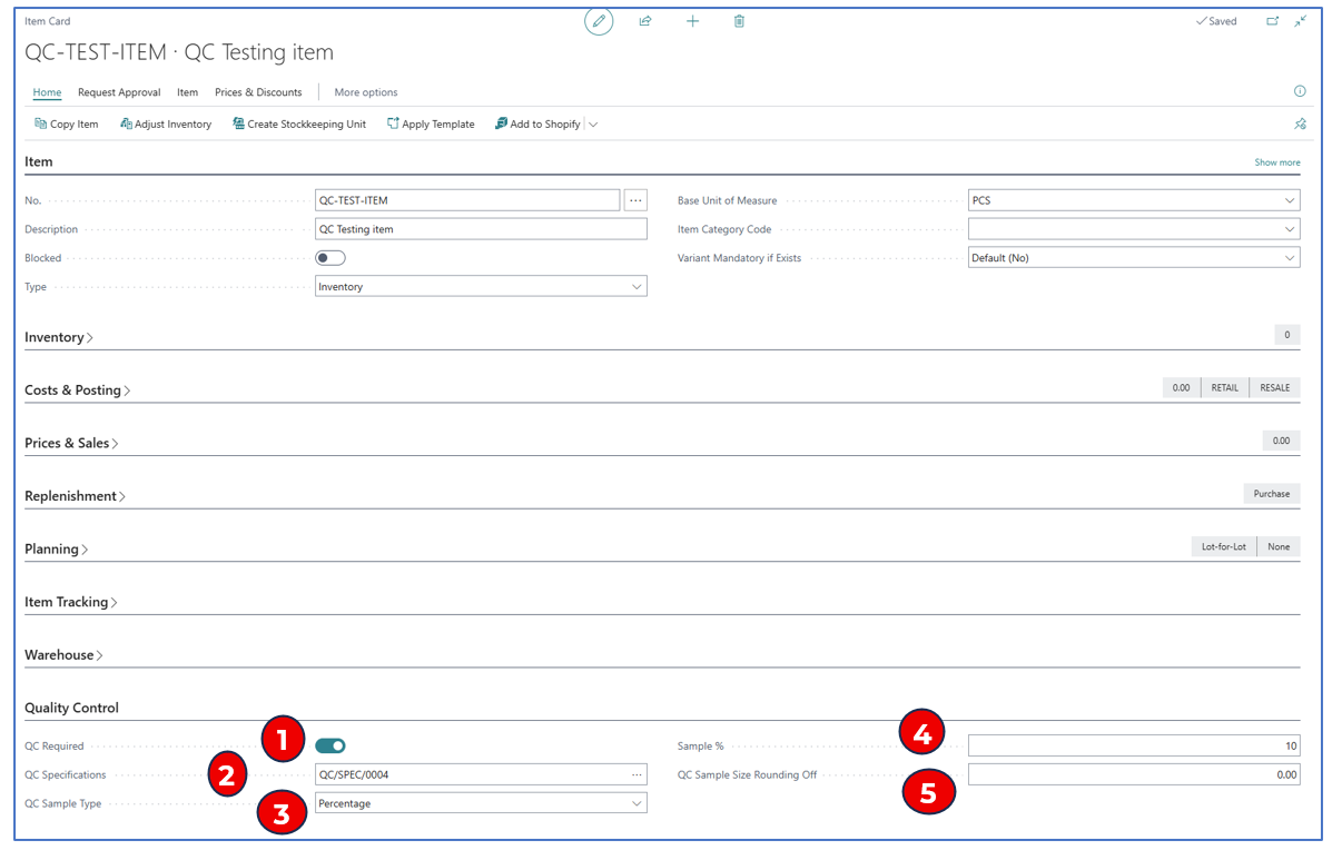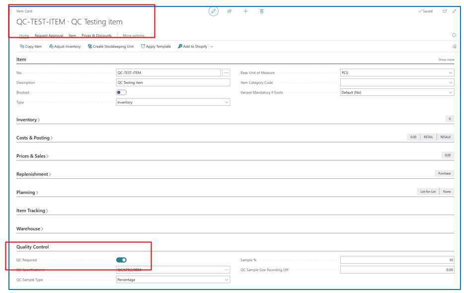 A new Fasttab Quality Control is added to the item card. Select values for the following fields: