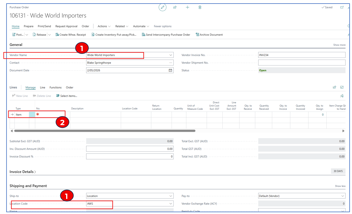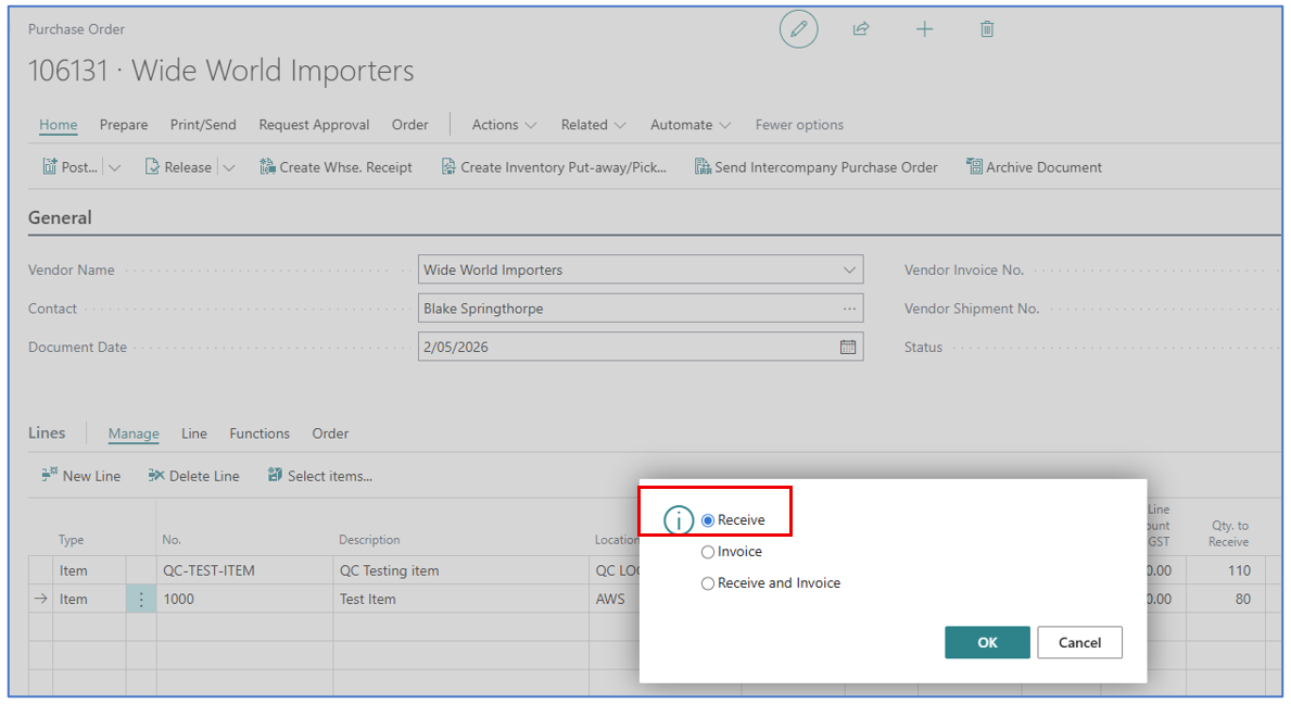 - When the PO entry is complete, post the Purchase Receipt by selecting Receive.