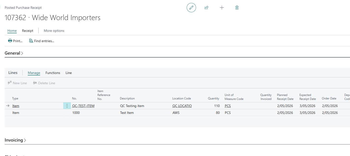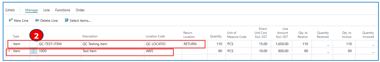When the selected item has QC Required, the Location code is automatically updated to the QC Location, and the Return Location is defaulted for quantities to be returned to the vendor (i.e. failed QC).