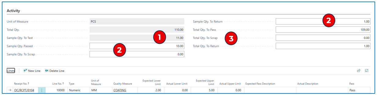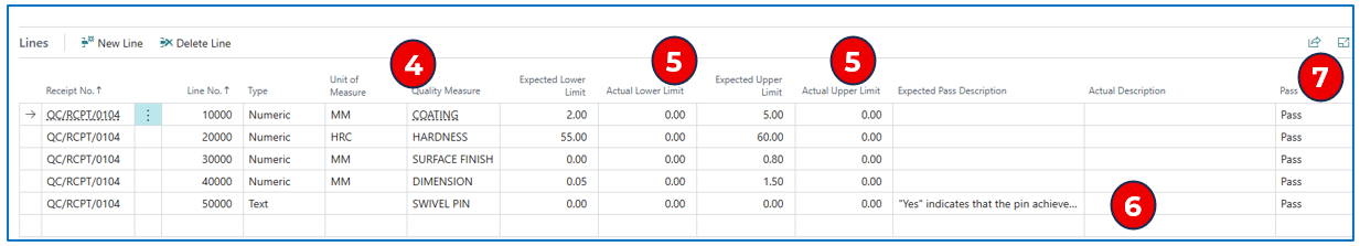 The quality measures from the item’s QC Specification No. are displayed in the QC Receipt line section: