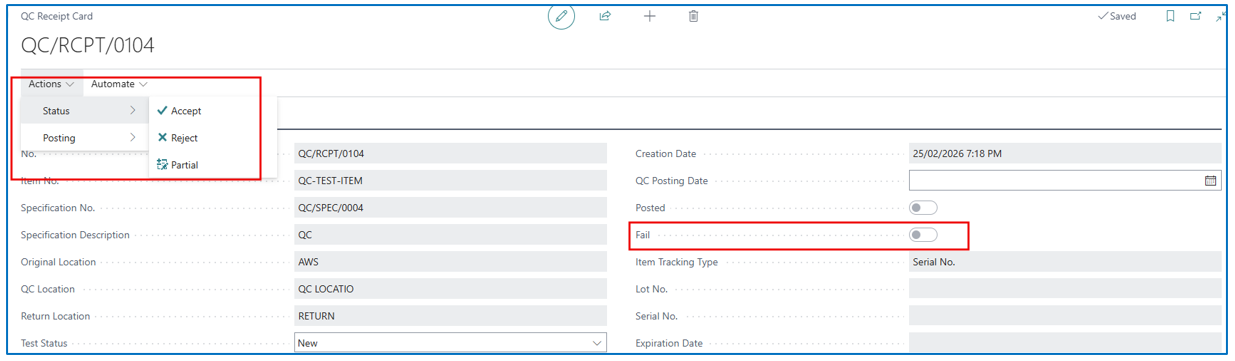 c) Posted and Fail: These are enabled according to the next step in processing the QC Receipt.