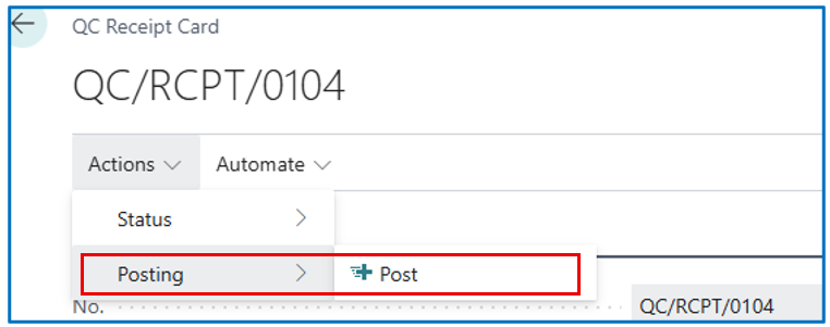 When the sample testing QC Receipt is closed with a status, the next step is to post the QC Receipt.