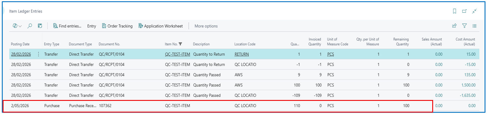 To review the stock movement in the Purchase Receipt and QC process, we can view the Item Ledger Entries.