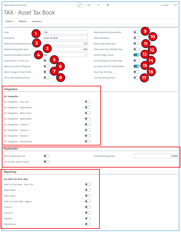 GST on Net Disposal Entries — If Net disposal calculation method is used, this flag allows GST to be calculated on the net value.