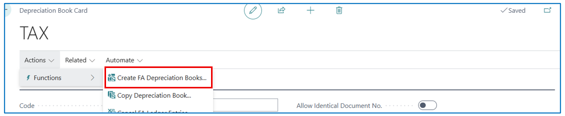 To assign a new depreciation book to several fixed assets in the Depreciation Book card, navigate to Actions > Functions > Create FA Depreciation Books.