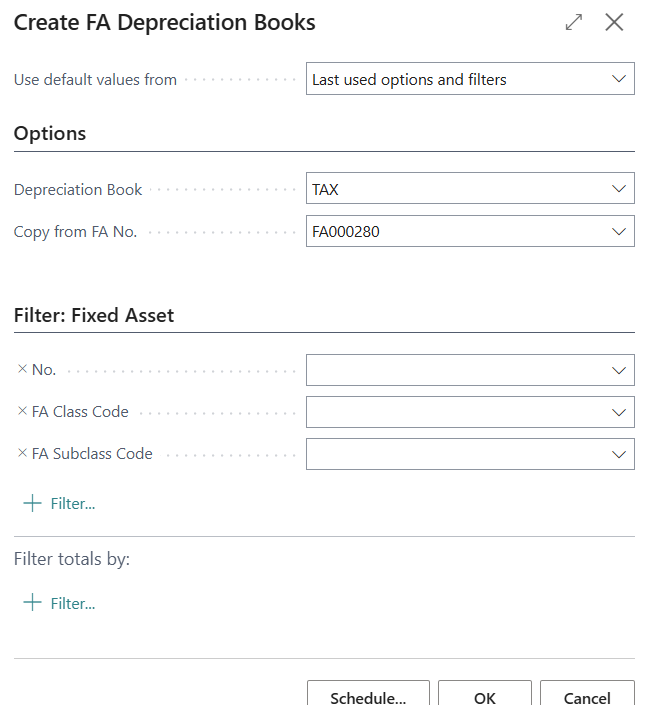 n the prompt, select the Depreciation Book Code to insert to multiple assets. In Copy from FA No., select the asset assigned with the Depreciation Book Code.