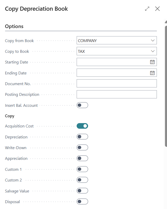 On the Depreciation Book card, navigate to Actions > Functions > Copy Depreciation Book to open the prompt.