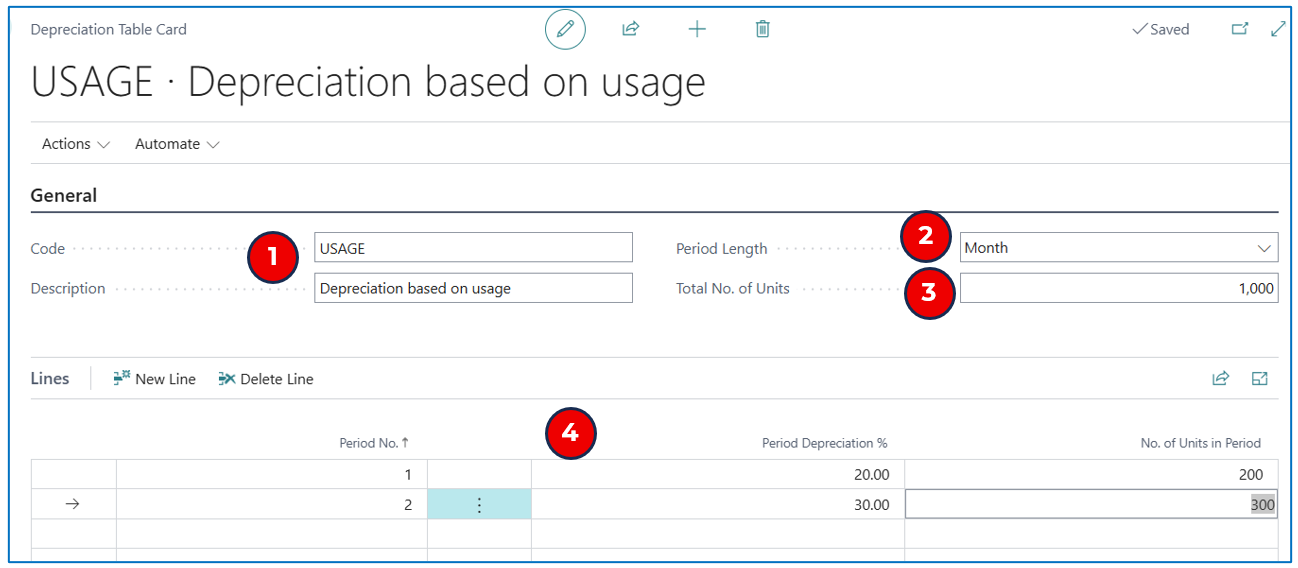- In the Lines section, indicate the depreciation % or the units (ratio to the Total) for each period of depreciation.