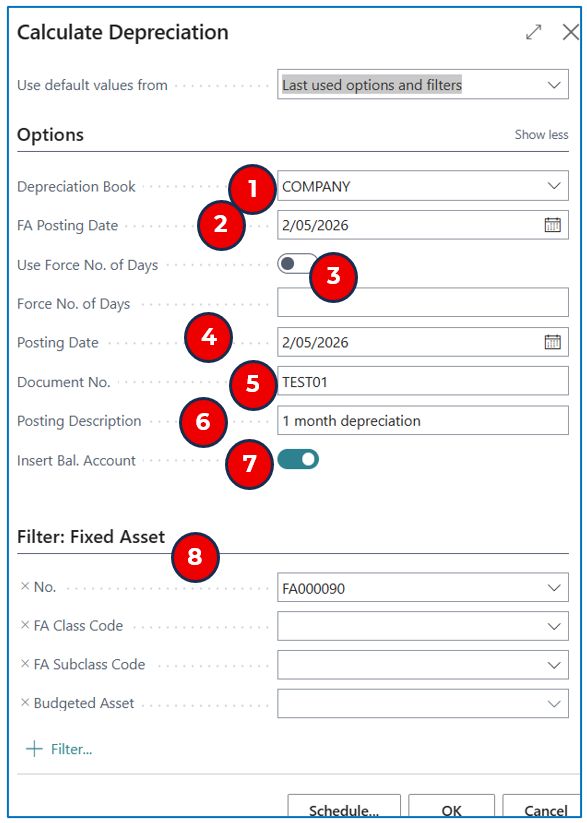 Filter: Fixed Asset — When calculating depreciation, use filters to select assets by class/subclass or by asset no. range. The batch calculation will result in a depreciation amount for each asset, based on the depreciation method assigned per asset.