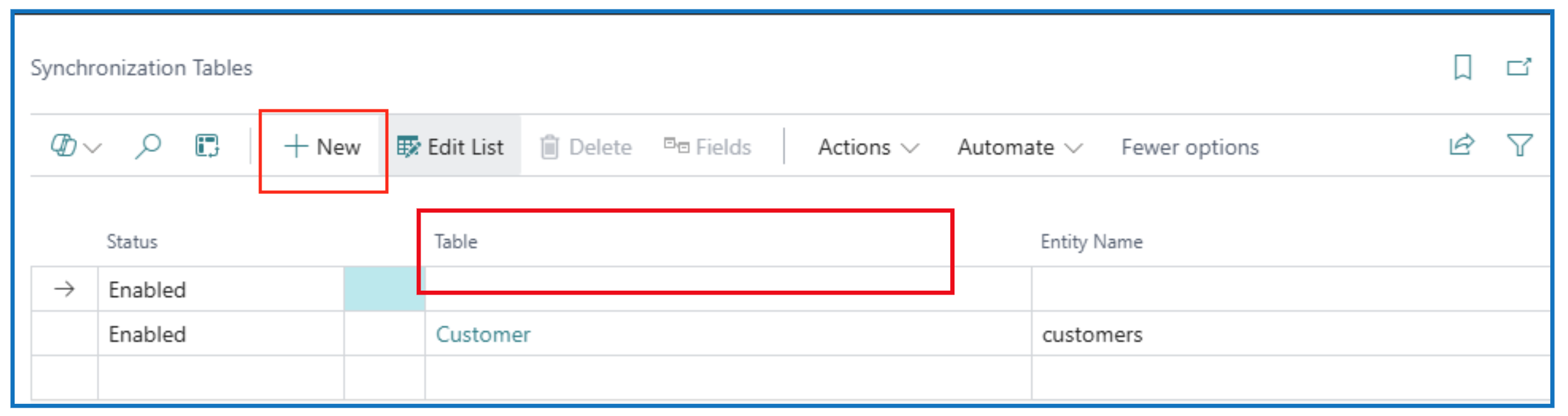 In the Synchronisation Tables page, select +New to add a new table for synchronisation:
