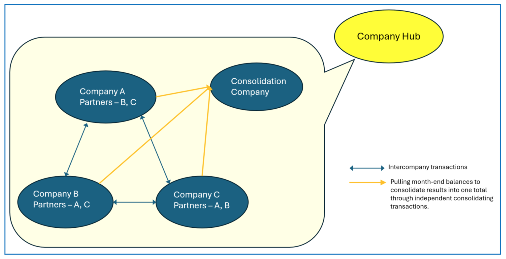 Each company’s transactions are posted into a single balancing GL chart of accounts to produce financial reports. When consolidation is required, each company is defined as a Business Uni and the Consolidating company “pulls” a set of month-end values from each business unit to combine.