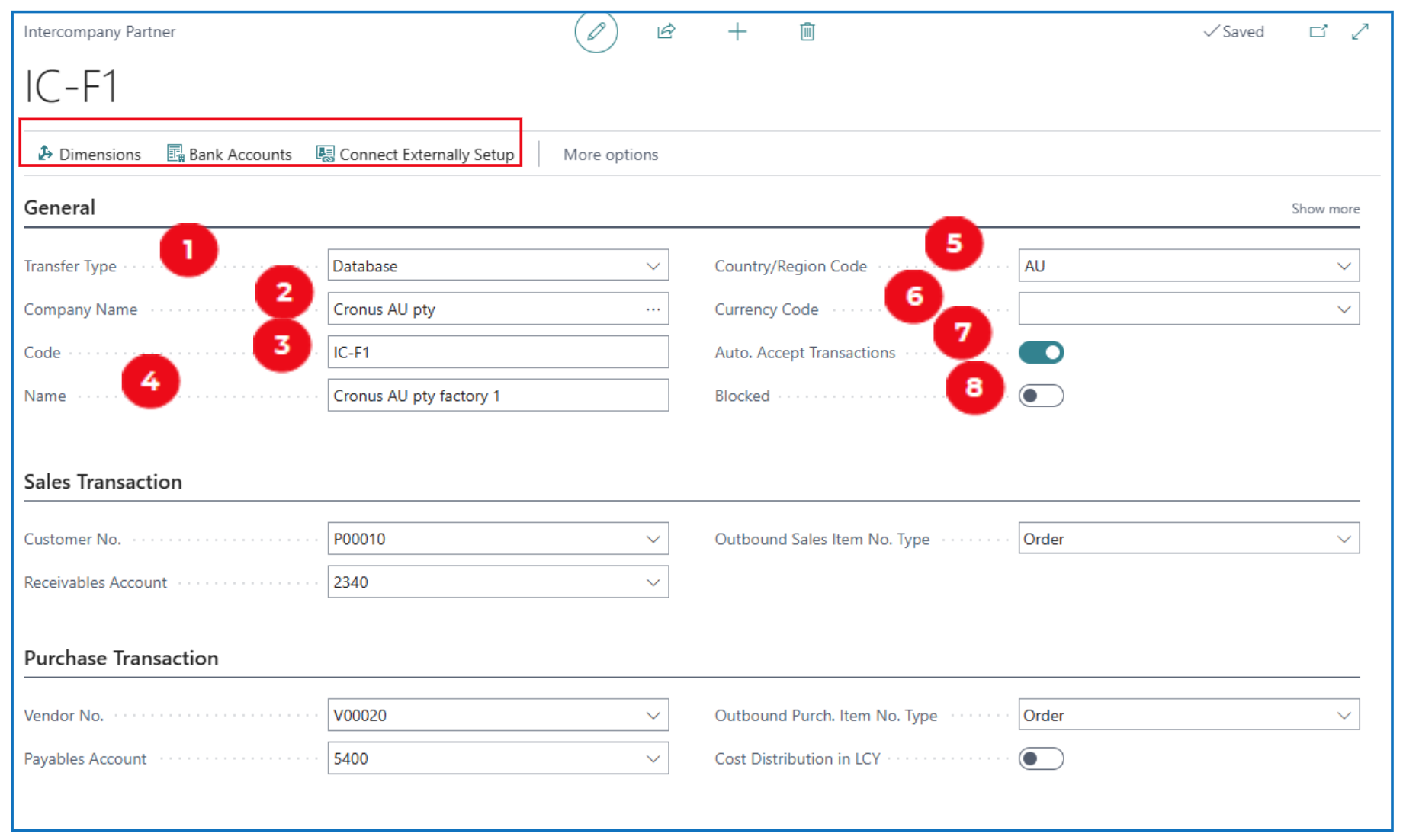 Dimensions, Bank Accounts (optional) If the intercompany transactions require updating of the destination company’s dimension or bank account, these have to be separately setup.