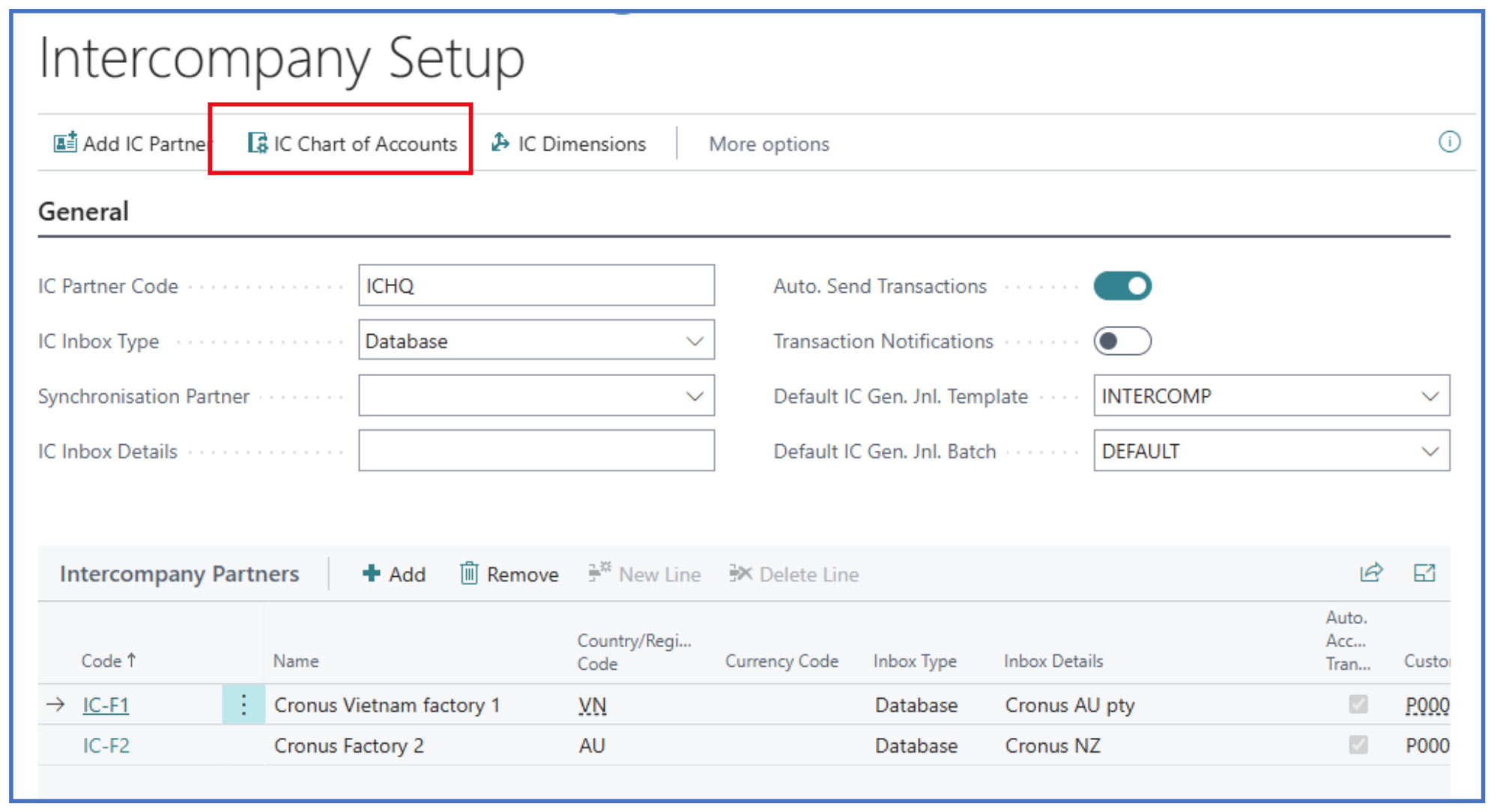 Once the intercompany partner is setup, the IC Chart of Accounts need to be mapped. The main company and partner company can have different COA codes for mapping to the Intercompany COA (but it helps to have the same COA codes).