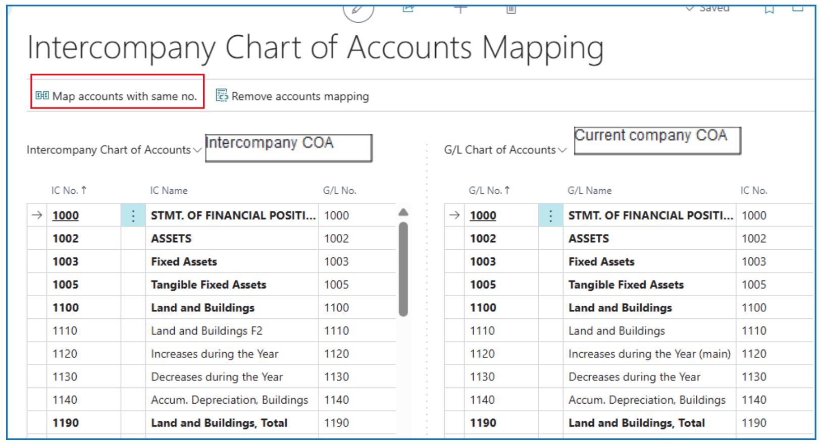 Select Map accounts with same no. for the system to map the COA on the left (Intercompany) with COA on the right (current company).