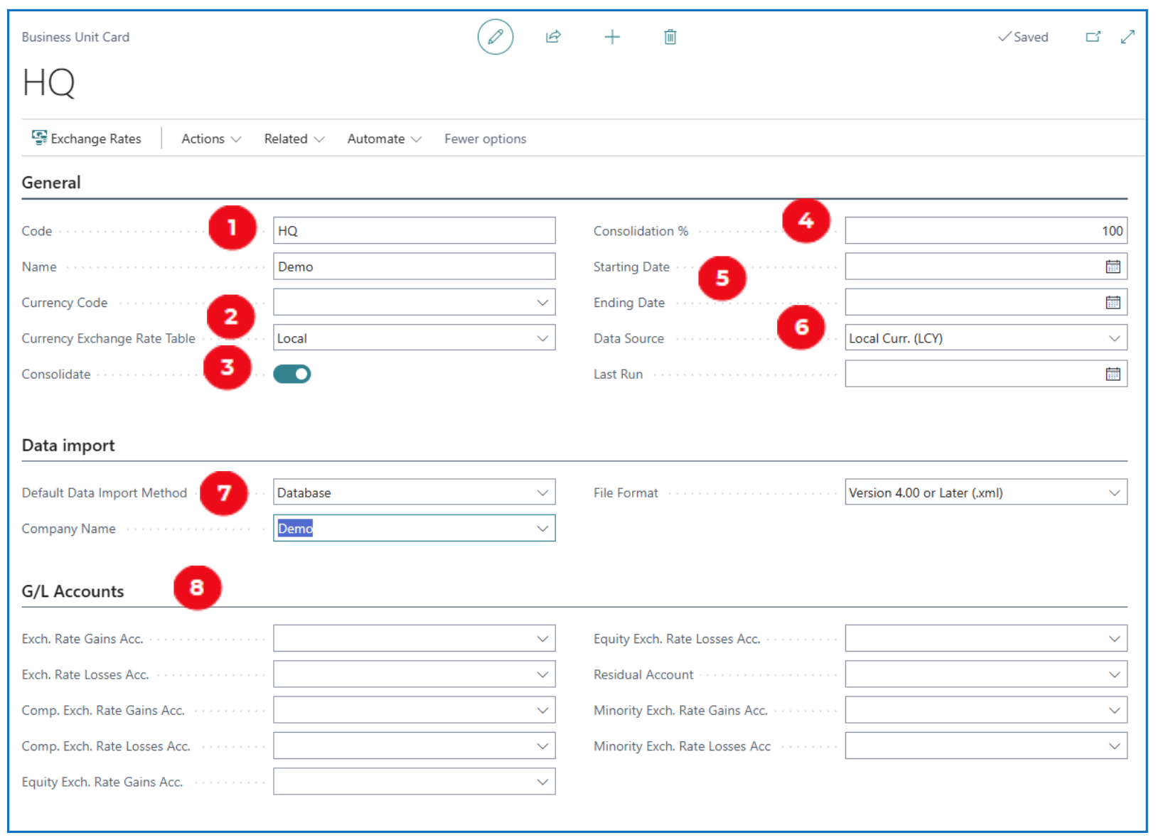 Consolidate: Enable this flag to include the defined business unit in the consolidation.