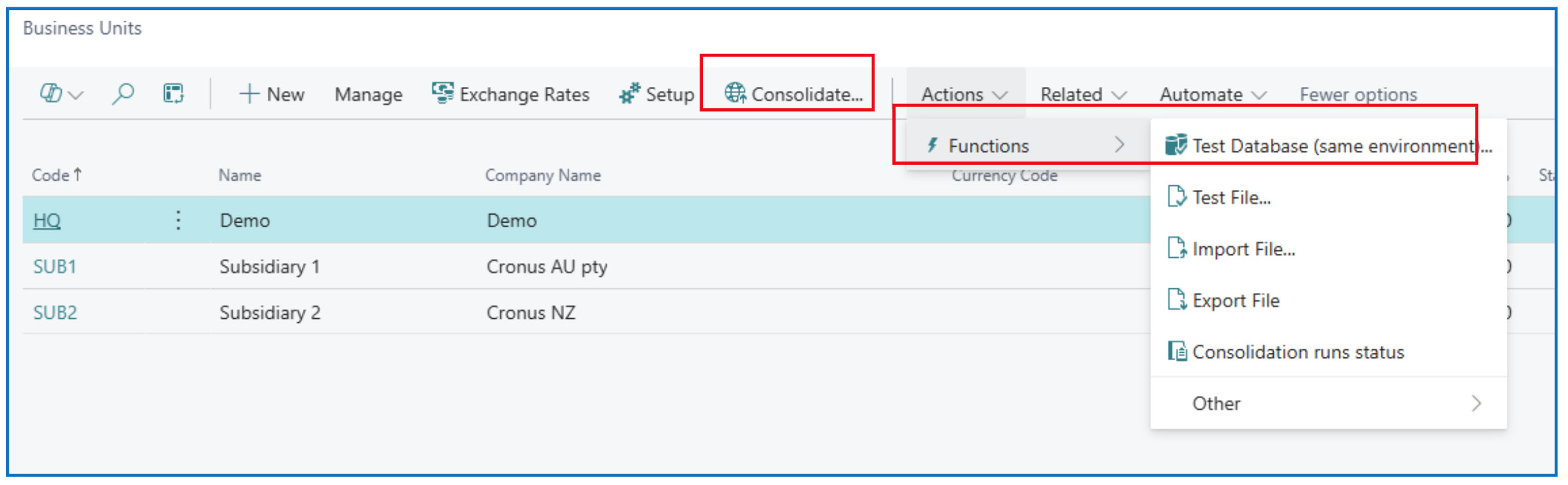 After all companies are defined as Business Units in the Consolidation Company, select Actions > Functions > Test Database (same relationship) to run a test report that validates the GL account mappings.