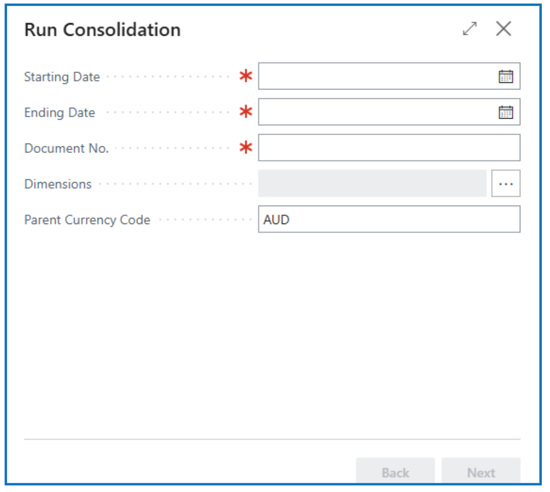 Once validated, select Consolidate to run the consolidation of business units. In the prompt, select the date range for consolidating transactions and the currency to use. Specify a document number for the consolidating transactions from business units.