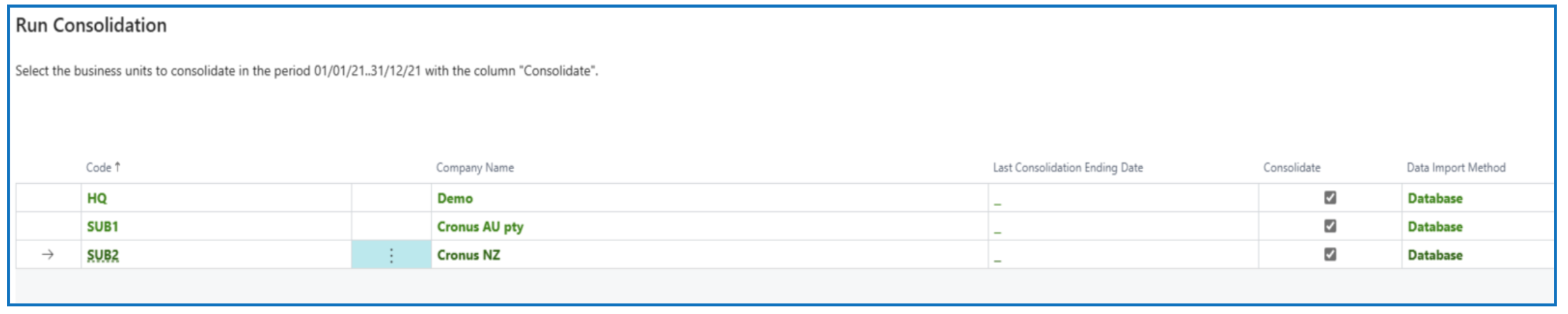 The setup of consolidation requires defining subsidiary companies as Business Units in the Consolidation company.