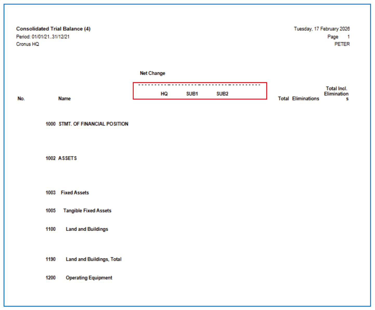 After posting the intercompany journals, run the Consolidation Trial Balance showing the elimination entries. Select Related > Reports > Trial Balance.