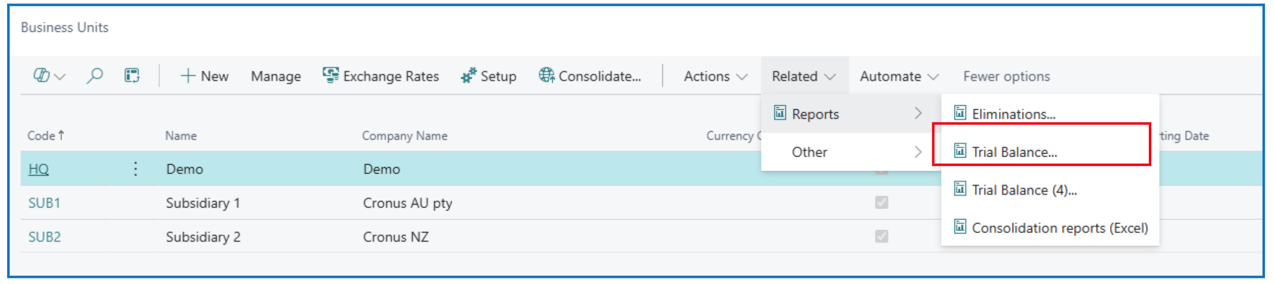 After consolidating from all Business Units, run the Trial Balance by selecting Related > Reports > Trial Balance (4) to view the trial balance columns for the business units.