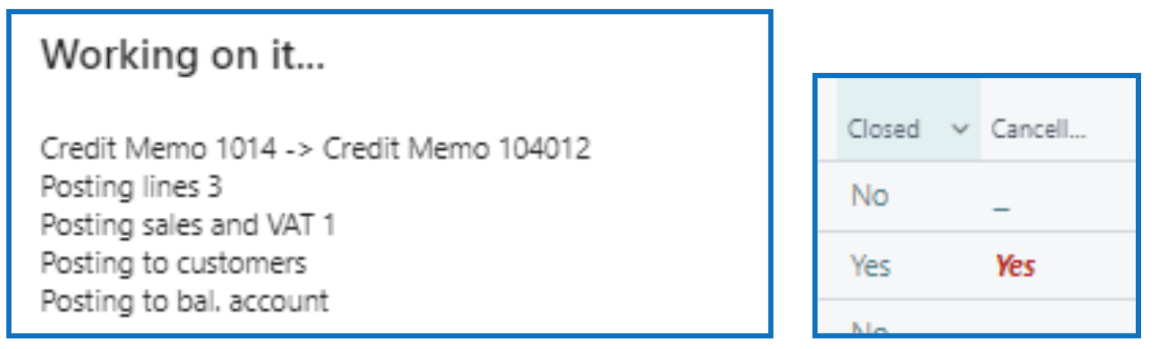 When completed, the invoice will have a closed and cancelled status, and the remaining amount will be $0 (i.e. no balance owing). The new Credit Memo will be created and posted with reference to the cancelled invoice.