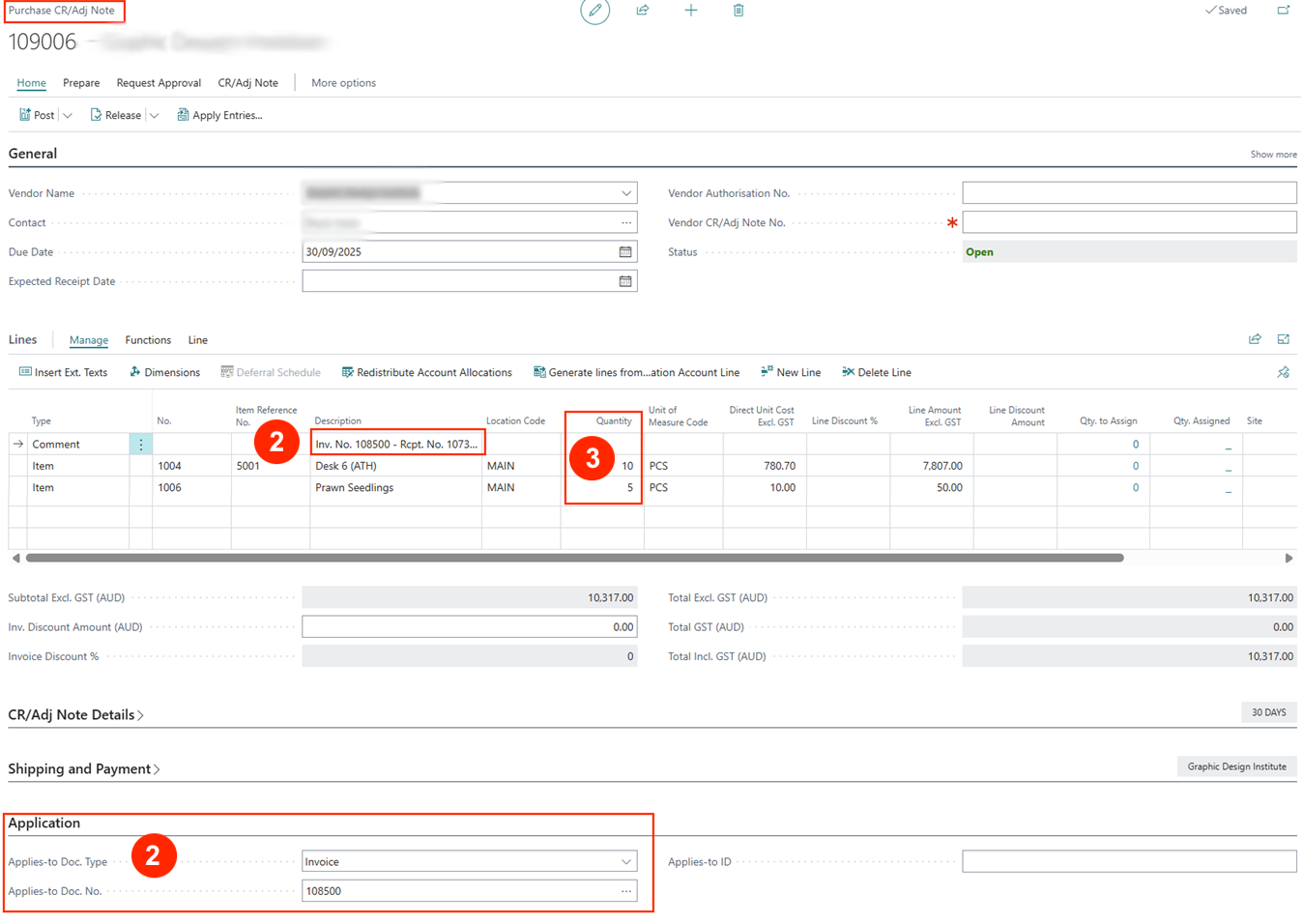 The new credit memo copies all purchase order lines and quantities.