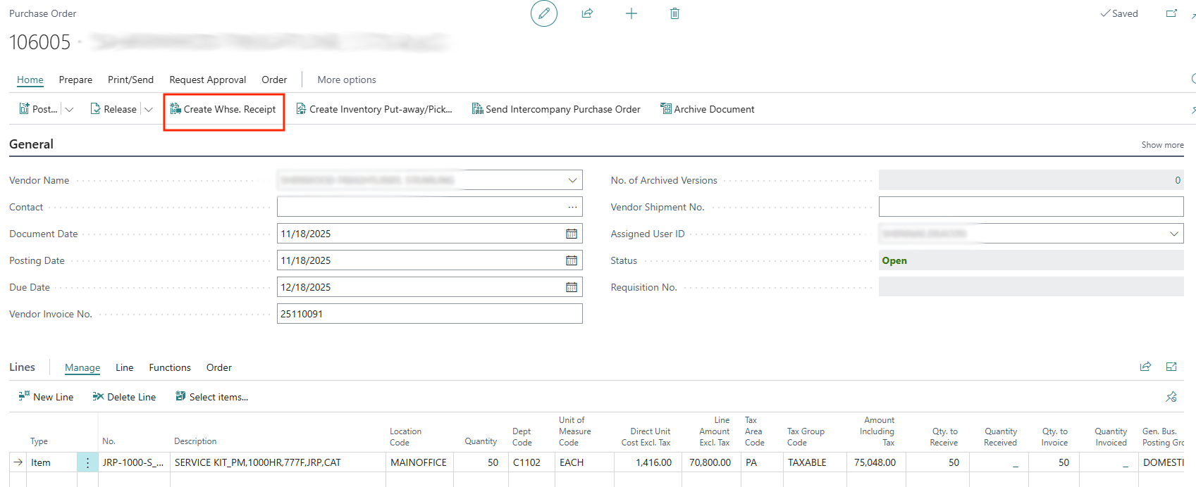 From the Purchase Order screen, the warehouse receipt can be created with menu option Create Whse. Receipt.