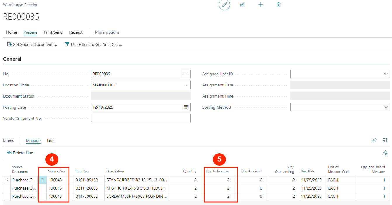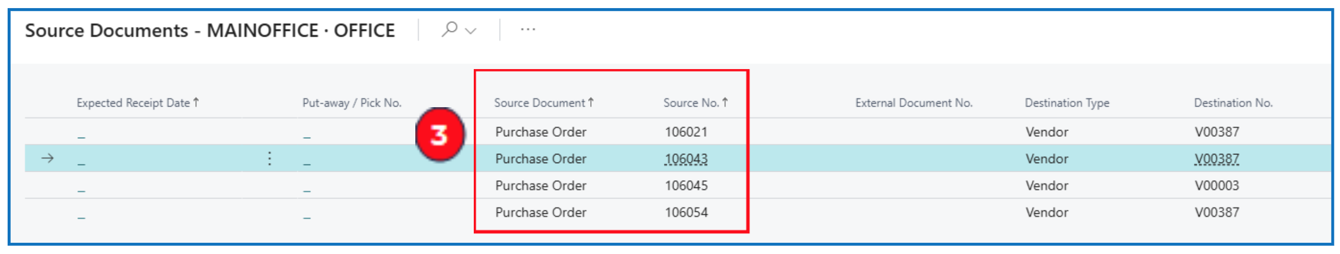 Click on menu option Prepare > Get Source Documents. This opens a page listing all “released” purchase order lines for the selected location.