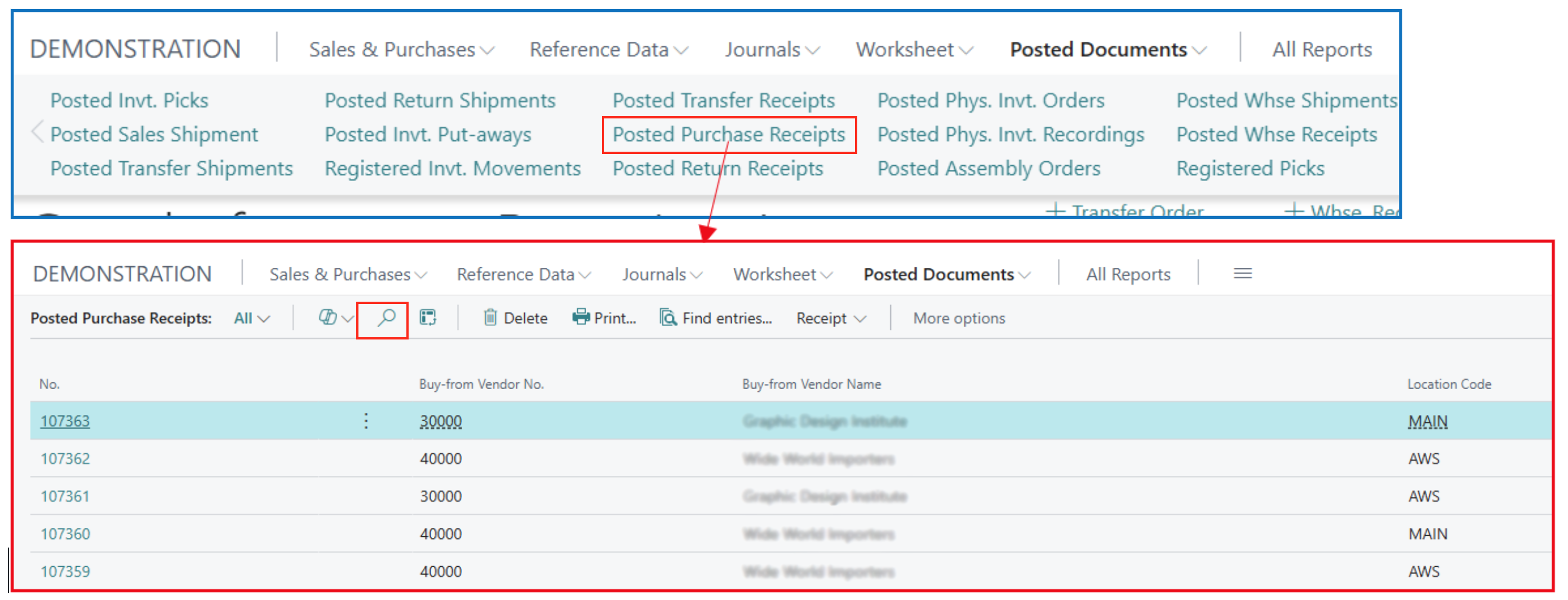 Use the Posted Purchase Receipt menu option to open the list page showing all posted purchase receipts