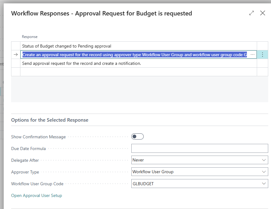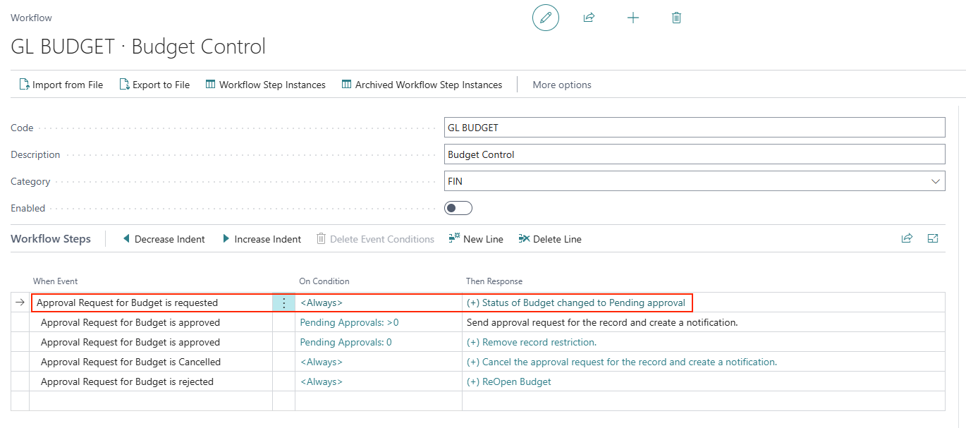 The workflow can be modified from an existing Finance workflow template where the Event is selected for Budget: