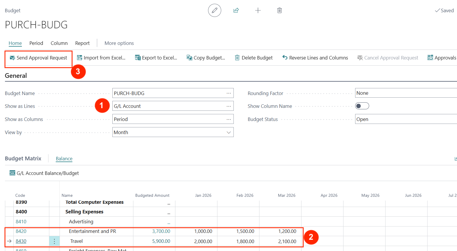 3. Send Approval Request — Send the budgets (by G/L Account) for pre-approval.