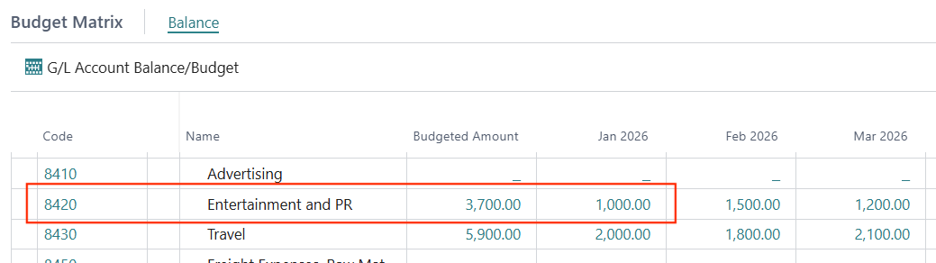 Once the G/L Budget is approved (status=“Released”), spending against the budgeted G/L account is then tracked for every Purchase Order or Purchase Invoice line.