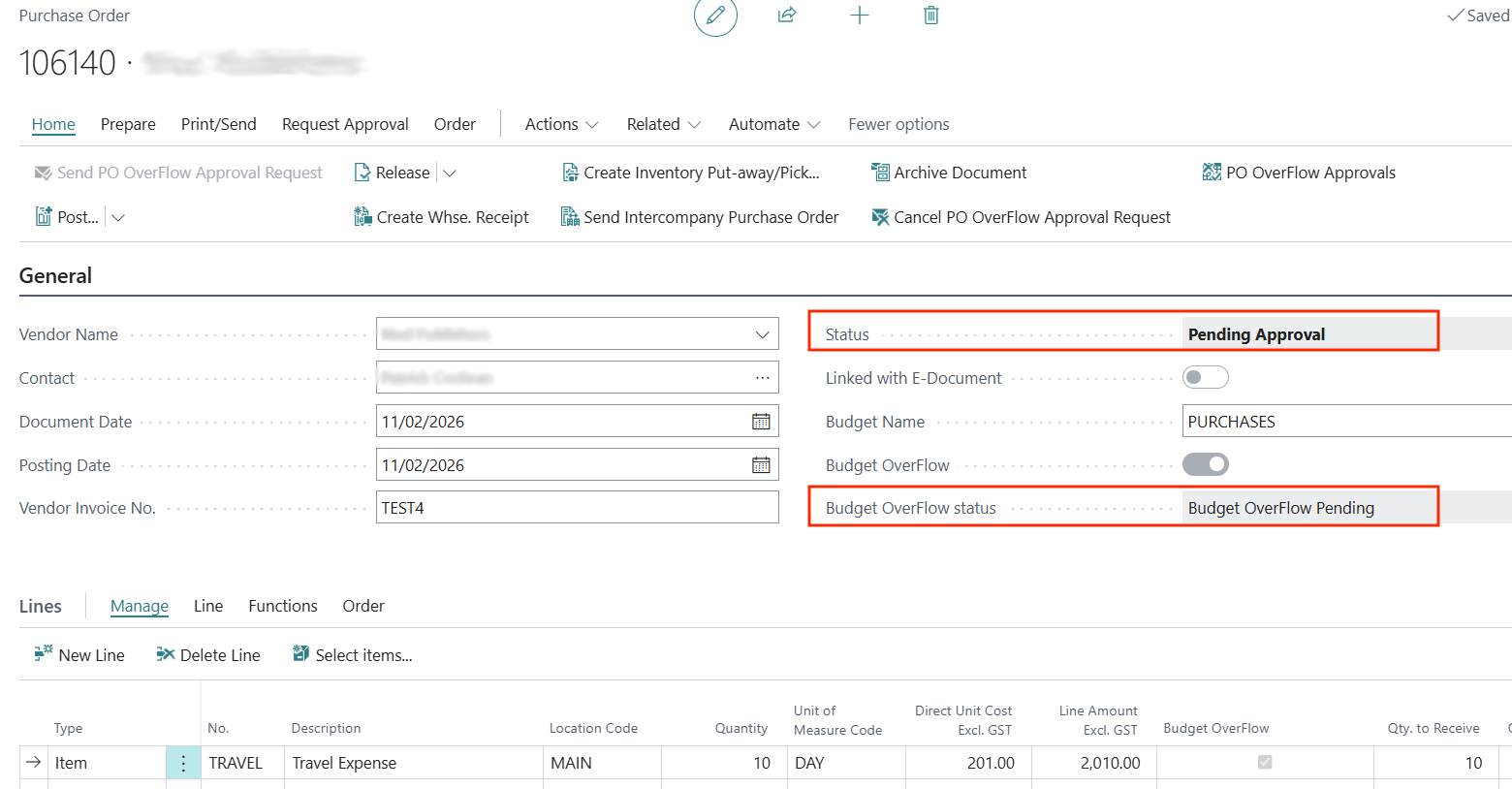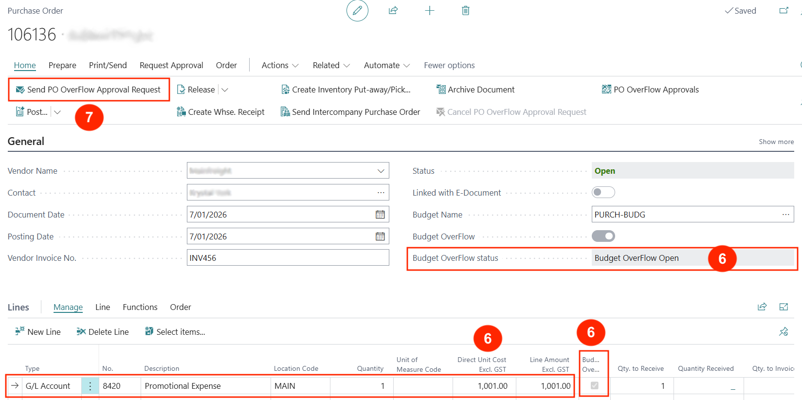 To approve a budget overrun for the period, based on the G/L Account Budget, the Purchase Order must be sent for budget overflow approval.