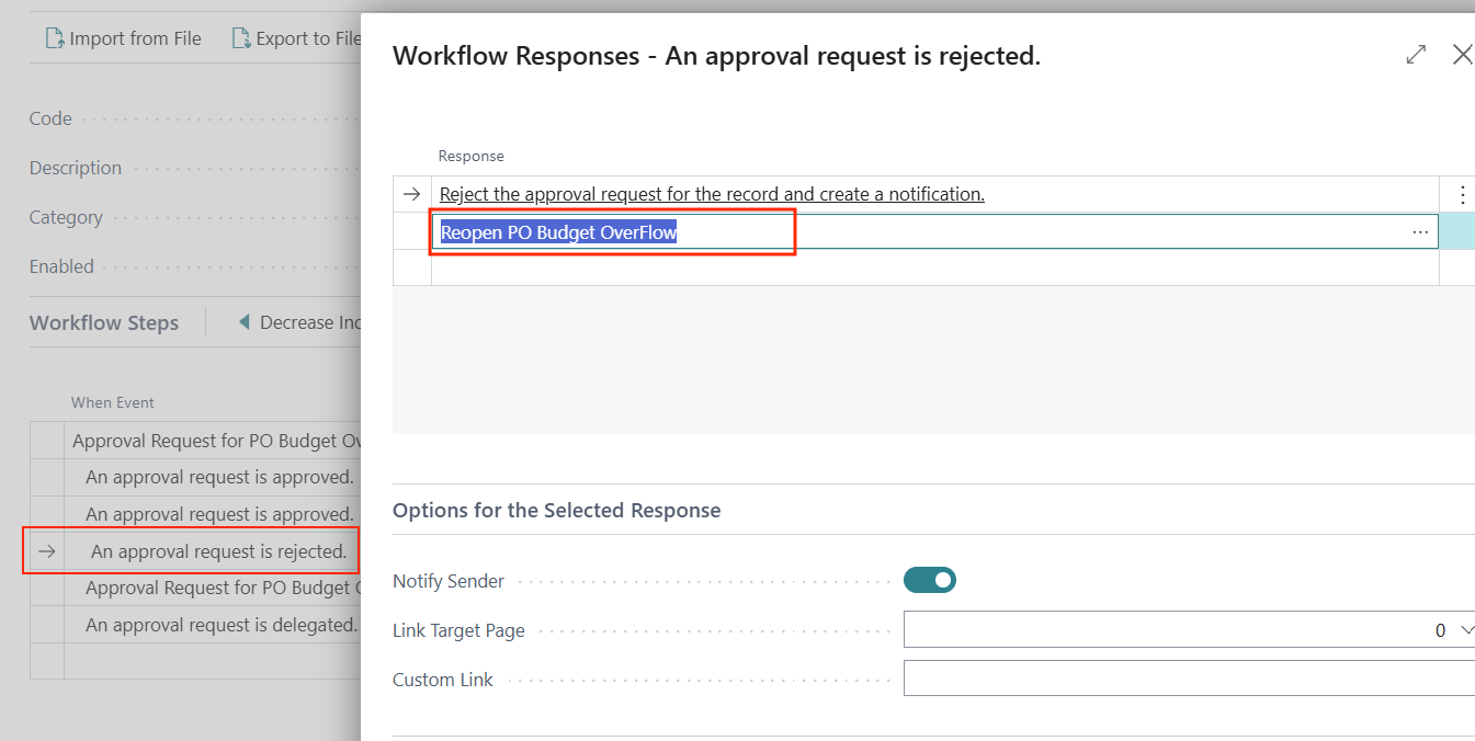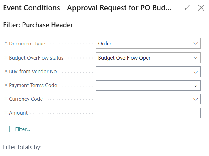 The Budget Overflow Approval Workflow uses the Approval Request for PO Budget Overflow event as shown below: